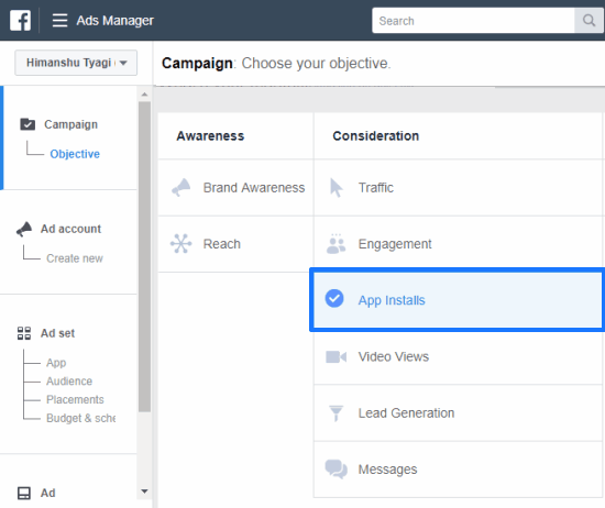Visit Facebook Ads manager and create an account. After that, choose to create an ad from the Facebook Ads manager dashboard. After that, you have to choose an objective for your ad. As you want to drive more app installs, you must select App Installs from the list of options, as shown below.